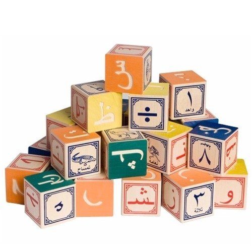 | Our Arabic language set contains 28 blocks representing each of the letters of the Arabic alphabet and their separate form depending on where they are in the word. This set also contains 3 complete sets of numerals plus arithmetic operators and 28 animal pictures. Made from Michigan basswood, brightly colored with child-safe inks, and handcrafted with attention to detail. The blocks are a generous 1 ¾" (44mm) cubed a perfect size for small hands! ...Read more |