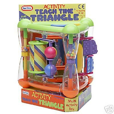 | A great toy for children 9 months and up, this toy is full of different activities for your child to do. It is triangle-shaped and every nook and cranny of the toy is covered by something colorful and fun. It makes sounds, has a little mirror and things to spin, shake and pull. Everything is self-contained and attached. Contains no dangerous parts. Perfect for developing motor skills. Let your children learn as they play with this Teach Time Triangle. ...Read more |